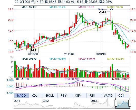 今开: 14.87 成交量: 2.84万手 振幅: 5.58% 最高: 15.46 成交额: 4294.09万元 换手率: 4.15% 最低: 14.63 总市值: 20.35亿 市净率: 6.26 昨收: 14.88 流通市...