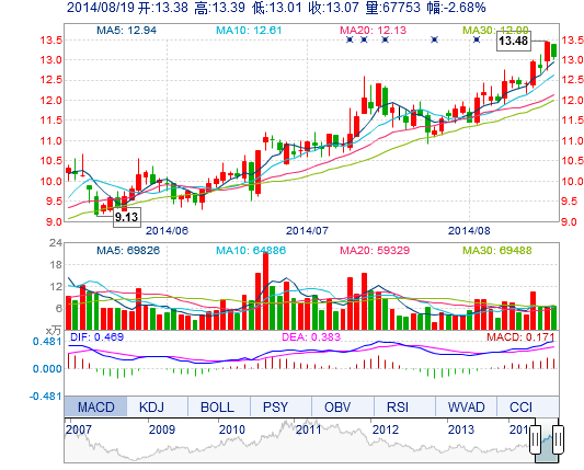 | 今 开: | 13.38 | 成交量: | 6.78万手 | 振 幅: | 2.83% |