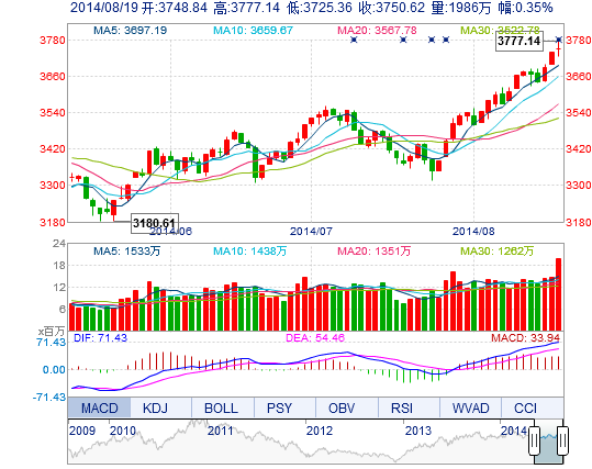今开: 3748.84 最高: 3777.14 昨收: 3737.52 最低: 3725.36 成交量: 1986.05万手 振幅: 1.39% 成交额: 321.19亿元