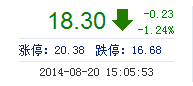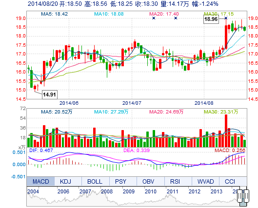 今开: 18.50 成交量: 14.17万手 振幅: 1.67% 最高: 18.56 成交额: 2.60亿元 换手率: 1.48% 最低: 18.25 总市值: 193.17亿 市净率: 5.24 昨收: 18.53 流通市值...