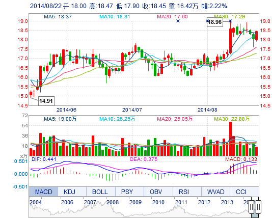 今开: 18.00 成交量: 16.42万手 振幅: 3.16% 最高: 18.47 成交额: 2.99亿元 换手率: 1.72% 最低: 17.90 总市值: 194.75亿 市净率: 5.28 昨收: 18.05 流通市值...