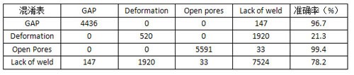 通过对缺陷的镀锌钢板接头获得有特征的中红外图像数据集,来评估缺陷检测和分类。结果在表3中给出,第一列是缺陷的类型,以下TP(truepositives)代表正确,FP(falsepositives)代表误报,FN(falsenegatives)代表漏报。表3显示一些缺陷分类失败,大多数这些失败在于缺陷类型之间混淆。