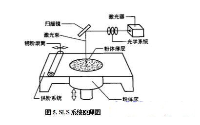 选择性激光烧结技术(Selective Laser Sintering,SLS)又称为选区激光烧结技术,其使用激光束熔化或烧结粉末材料,利用分层思想,把计算机中的CAD模型直接成形为三维实体零件。它的创新之处在于将激光、光学、温度控制和材料相联系,并借助精确引导的激光束使材料粉末烧结或熔融后凝固形成三维原型或制件。 选择性激光烧结技术工艺原理如图5所示。其工艺过程是,用红外线板将粉末材料加热至恰好低于烧结点的某一温度,然后用计算机控制激光束,按原型或零件的截面 形状扫描平台上的粉末材料,使其受热熔化 或烧结。继而平台下降一个层厚,用热辊将 粉末材料均匀地分布在前一个烧结层上,再 用激光烧结。如此反复,逐层烧结成形。全部烧结后去掉多余的粉末,再进行打磨、烘 干等处理便获得原型或零件。这种工艺与立 体印刷成形(SLA)基本相同,只是将SLA 中的液态树脂换成在激光照射下可以烧结的粉末材料,并由一个温度控制单元优化的辊子铺平材料以保证粉末的流动性,同时控制工作腔热量使粉末牢固黏结。SLS技术不受零件几何形状的限制,不需要任何的工装模具,可以缩短产品的研发周期,降低生产成本,提高产品的市场竞争力。其造型速度快,一般制品仅需1~2天即可完成。