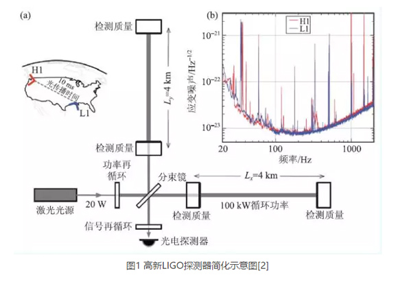 所有这些干涉仪技术措施,都是为了使引力波应变产生的光学信号最大化,从而降低光子散粒噪声。光子散粒噪声是由到达光电探头的光量子的统计涨落引起的,它是激光干涉引力波探测器高频端的主要噪声来源,它对信号信噪比的影响与干涉仪中激光功率的平方根成反比。未来数年,高新LIGO 探测器计划通过增加入射激光功率,把干涉仪中循环的激光功率提高至750 kW,进一步降低噪声[4]。