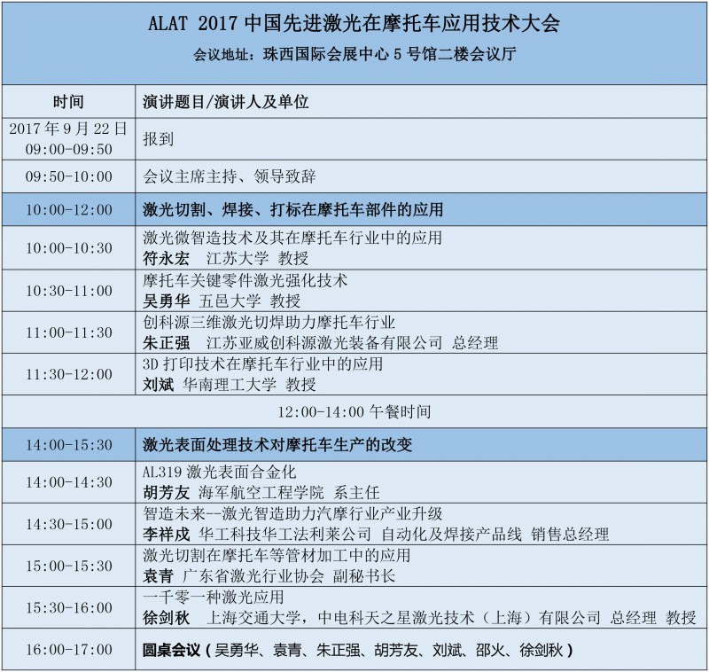 9月22日,由五邑大学、广东省激光行业协会联合主办的ALAT 2017中国先进激光在摩托车应用技术大会将在广东珠西国际会展中心(江门)举办,本次大会已邀请来自国内摩托车研究单位、知名院校及企业的专家学者和骨干人员,围绕“激光智造”核心主题,探讨当前国内激光在摩托车应用的前沿技术及热点问题,介绍相关领域最新发展状况,促进国内激光技术应用的交流和发展。