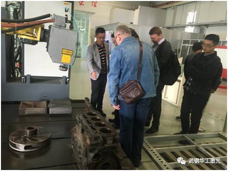 在武钢华工激光专业人员的陪同下,古丽耶夫·亚里山大院士一行参观了国家级激光工艺应用中心、武钢华工激光公司生产基地,详细了解了公司的发展历程、产业布局、最新产品科研成果以及三大主要产品(激光强化及熔覆装备、轧辊激光无序毛化装备、激光清洗装备),详细询问了激光表面制造技术在冶金、煤机、模具、军工、科研院校等领域应用情况,特别是轧辊无序毛化技术、内孔激光熔覆技术、3D打印技术通过创新取得的成果和实效。