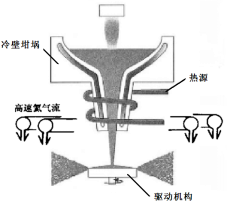 为避免金属熔炼过程中与陶瓷坩埚接触而导致非金属夹杂,采用冷壁铜感应坩埚取代陶瓷坩埚,这种方式称为基于冷壁坩埚的真空感应熔炼惰性气体雾化法(VIGA-CC)。