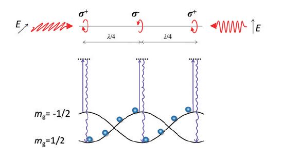 2束对射激光的偏振分别为左旋和右旋偏振,也会形成偏振梯度冷却。另外,在有磁场的情况下,即使光场没有偏振梯度,也可以发生低于多普勒极限的冷却。这些亚多普勒冷却的方案都有自发辐射过程的参与,光子动量反冲造成原子速度的涨落成为冷却温度极限,即反冲极限温度。突破这个反冲极限温度,只能让原子与光不发生作用,使速度为0的原子进入暗态,可以采用速度选择相干布居囚禁(VSCPT)的方法。另一种方法,利用受激拉曼跃迁也可实现原子速度的选择,获得低于光子反冲极限的冷却温度,称为拉曼冷却。