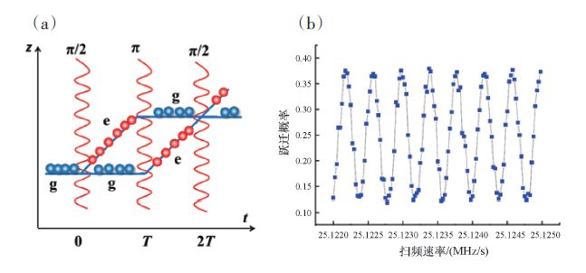 冷原子干涉仪的基本原理如图11所示,利用MOT制备处于基态g的冷原子团。初始时刻,利用2束脉冲时间为τ 的拉曼激光脉冲作用至该原子团,原子有50%的概率被双光子受激拉曼跃迁到e能级;同时,受到光子的动量反冲作用,在z 方向上e能态的原子与g能态原子分离,即实现冷原子团“分束”。经过时间T后,再利用作用时间2τ 的拉曼激光脉冲,使e态的原子返回g态,处于g态的原子跃迁至e态,同时,原子运动轨迹发生改变,即实现冷原子团“反射”。最后利用脉冲时间为τ的拉曼激光,完成原子的“合束”。探测处于e态(或g态)原子的数目,得到图11(b)的原子干涉条纹。在冷原子干涉路径上,重力等外场因素将引起干涉相位的变化,因此可以利用原子干涉仪测量重力加速度等。