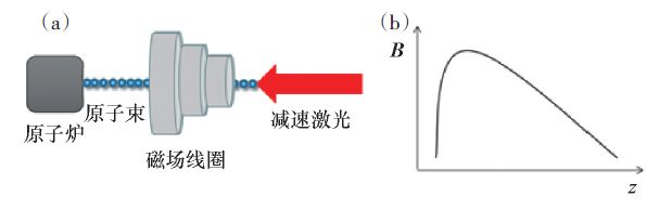 为提高原子束的减速效率,需要在减速过程中连续地补偿多普勒频移。采用的一种方案是连续扫描激光的频率,使激光与原子跃迁频率持续保持共振;另一种是保持激光的频率不变,利用磁场对原子塞曼效应,改变原子的跃迁频率,称为塞曼减速。如图3所示,采用磁场线圈可以实现强度随空间变化的磁场,设计磁场分布曲线,使原子跃迁频率的变化与多普勒频移匹配,原子在行进过程中与激光持续作用,速度不断降低,实现激光减速过程。