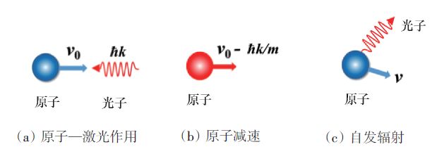 激光对原子的操控依赖于光对原子的机械作用,这种作用源于光的电磁场性质,且与原子的内部和外部状态相关。图2用简化为一维的模型介绍基本原理。一个初速度为ν0的原子受到一束反向的近共振频率红移光照射,当光的频率红移与原子速度ν0产生的多普勒频移大小相等符号相反,光与原子跃迁频率共振,原子吸收1个光子(动量为ћk)由基态跃迁至激发态,同时速度降低为ν0-ћk/m,m 为原子质量。处于激发态的原子在有限时间内发生自发辐射,回到基态,自发辐射光子的方向随机。回到基态的原子将再次与光作用,形成循环跃迁。由于自发辐射光子的方向随机,原子n 次(n 足够大)作用自发辐射的累积平均动量为0,而经历n 次受激吸收,原子的速度变为ν0-nћk/m,实现激光对原子的减速。