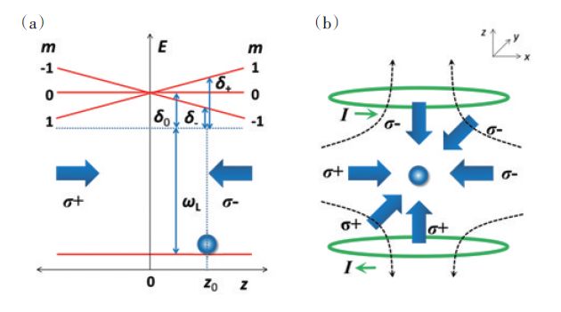 光学阻尼不是势阱,它对原子运动产生阻尼减速,不产生指向中心的恢复力,无法起到囚禁原子的作用。在光学阻尼上添加2个线圈(图6(b)),通以方向相反的电流,可在光学阻尼中心形成磁场强度为0的反亥姆霍兹磁场,就构成了磁光阱(MOT)。原子的磁子能级在磁场塞曼效应的作用下分裂(图6(a)),假定原子基态总角动量J=0,激发态J=1,含有m=0,±1这3个磁子能级,在中心处能级简并,沿水平坐标轴离开中心随磁场强度的增加而线性变化。沿z 轴对射激光作用至原子,频率为ωL,相对零磁场处原子共振频率的失谐为δ0,偏振分别为σ+、σ-。假定原子初始状态位于z0 (z0>0),由跃迁选择定则σ+激光的失谐为δ+,σ-激光的失谐为δ-,在z0>0处δ-<δ+,原子更多地吸收σ-光子,从而受到趋向于中心的负向力。同理,处于z0<0的原子更多地吸收σ+光子受到趋向中心的正向力。于是,所有原子都将受到指向坐标原点的辐射压力的作用。上述原理推广到三维,沿x、y、z 方向受到向心作用力,即实现MOT中原子三维的激光冷却和势阱囚禁。