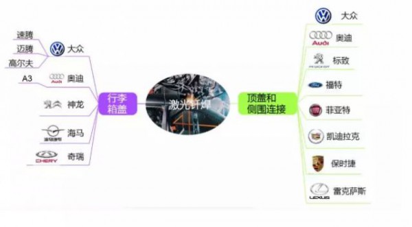 德国大众Touran轿车的激光焊缝总长度达到了70m。随后,奥迪、速腾、高尔夫及Passat等品牌的车顶采用了激光焊接技术,通用、丰田、福特、宝马、奔驰等公司陆续均采用了激光焊接技术。