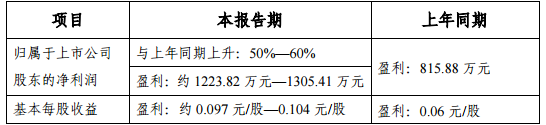 公司预计上半年净利为1224万元-1305万元,与上年同期815.88万元相比增长50%-60%。