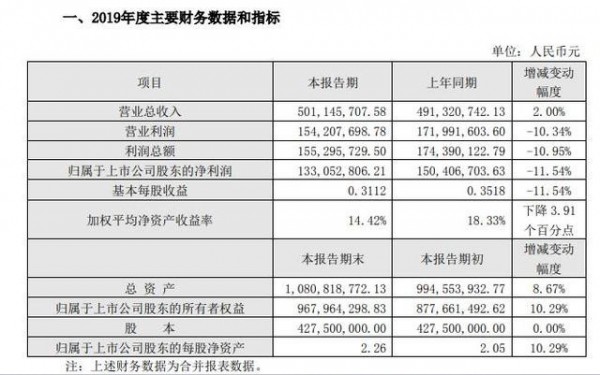 据了解,报告期内,国内外经济形势复杂,晶体业务市场需求放缓,晶体元器件业务收入小幅下滑,公司加强精密光学元件和激光器件的产品和市场开发,取得积极的成效,弥补了晶体元器件业务收入的下降。2019年度,公司实现营业收入50,114.57万元,比上年增长2.00%,实现归属于上市公司股东的净利润13,305.28万元,比上年下降11.54%;2019年末资产负债率为7.61%,比上年末下降2.30个百分点,资产结构未发生重大变化。