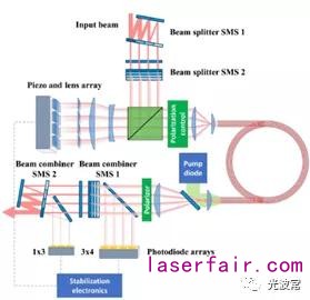 该系统使用两组分段镜面分束器将一束入射光在空间上分成16个光束。这种分束器由一块高反镜以及一个包含并排的四种不同反射率区域的镜面组成,反射率分别为0、50%、66%、75%,把初始光束分为4×4的矩阵,再用偏振分光器或4焦距系统来调节光束矩阵的间距,送到多纤芯光纤的端面。