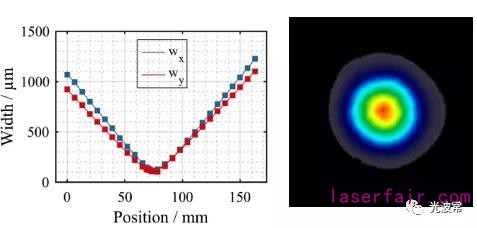 图7 多纤芯光纤系统光束M2测量(左)和合成后光束(右)