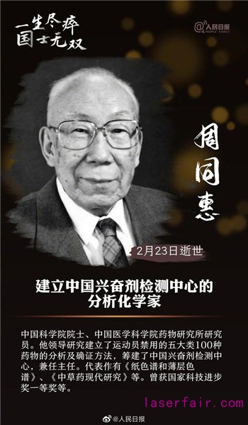 2月23日,中国共产党党员、中国科学院院士、著名分析化学家、中国医学科学院药物研究所研究员周同惠因病医治无效在北京逝世,享年95岁。 周同惠长期从事药物分析方法学的基础研究,开展中草药有效成分分析方法的研究、药物代谢及代谢产物的分析与鉴定方法的研究,领导研究建立了运动员禁用的五大类100种药物的分析及确证方法,创建兴奋剂检测中心,使我国成为亚运会历史上第一个由承办国独立进行兴奋剂检测的国家。他组建国家药物及代谢产物分析研究中心,为发展我国自己的创新药物发挥了重要作用。