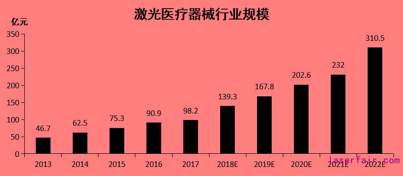 我国的激光医疗器械生产从上世纪90年代以来,年增长率高达20~30%,据中国产业信息网2017年的数据:激光医疗器械行业2017年市场规模98.2亿人民币,到2022年市场规模将达到310.5亿元人民币。据密尔医疗调研与分析,以上数据与全球宏观数据还有所出入,几个相对靠谱的数据是:2019年,全球激光医疗设备销售额约70亿美元,年复合增速约13%;其中激光皮肤治疗应用占比接近50%,年复合增速约14%;中国市场销售占比约15%,整体规模接近75亿元,年复合增速超过18%;中国激光皮肤治疗应用市场规模约30亿元,全球占比不超过12%。