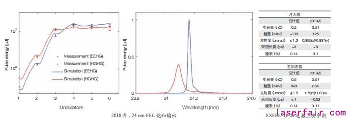 X 射线自由电子激光试验装置的项目建议书于 2011 年 2 月获得国家发展和改革委批复,2014 年 12 月在“上海光源”园区内举行开工奠基仪式,启动工程建设。SXFEL-TF 是基于外种子模式的自由电子激光装置,采用光阴极注入器产生高亮度电子束,采用 C 波段常温直线加速器作为主加速器将电子束团加速至高能量,随后在波荡器系统中产生全相干的软 X 射线自由电子激光,其 FEL 输出波长为 8.8 nm。SXFEL-TF 主要开展对先进 FEL,尤其是外种子型 FEL 运行模式的实验研究。2018 年实现了 HGHG 和 EEHG 模式下的 24 nm FEL 饱和输出,这是国际上首次在 EUV 波段实现 EEHG 放大饱和,其脉冲能量达到百微焦量级,同时由测量光谱可见 EEHG 的相干性好于 HGHG;2019 年 3 月主加速器进行了技术测试,全面达到设计指标;2019 年 4 月实现 8.8 nm 自由电子激光的出光放大,光子能量及脉冲长度达到设计指标,辐射功率接近设计指标。