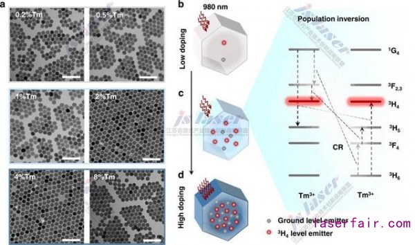 图解:功率变化的时候上转换纳米粒子在可调制掺杂浓度的以及自组装的UCNPs在增益介质在聚苯乙烯微球作为微腔的条件下的发射特征