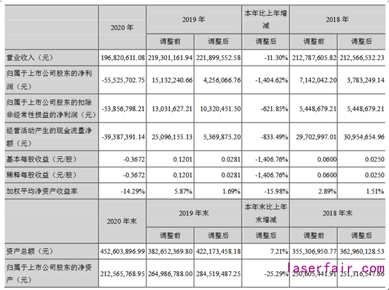 金运激光(300220)近日发布2020年度报告,报告期内公司实现营业收入196,820,611.08元,同比下滑11.30%;归属于上市公司股东的净利润-55,525,702.75元,上年同期4,256,066.76元,由盈转亏。
