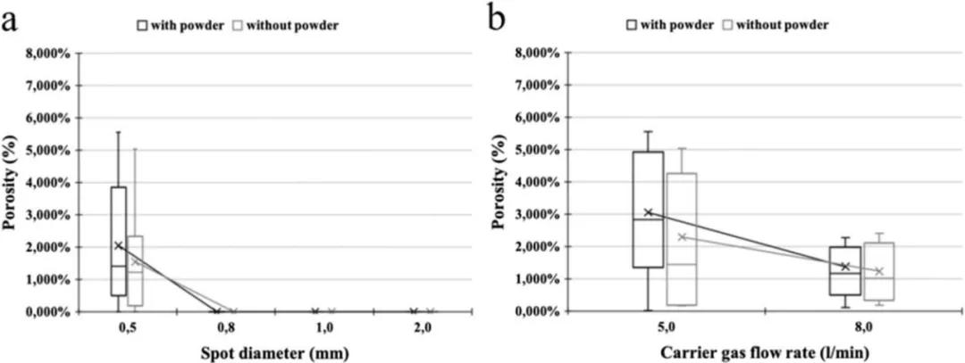 此外,载气流速对孔隙率的影响如图3(b)所示。根据方差分析结果(P值= 0.001),载气流速影响最终孔隙率。载气流速从5升/分钟增加到8升/分钟导致总孔隙率降低。无论有无粉末,这种趋势都是一样的。其原因在于高载气流速不仅将粉末送至工件上,而且保护焊接区域免受空气气体的侵入。
