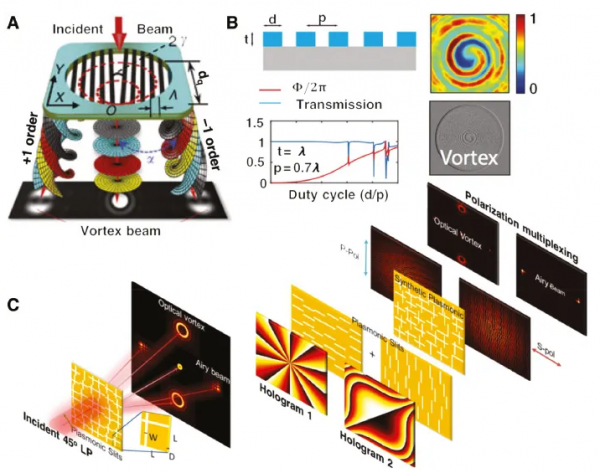 图2 由超表面全息图产生的光学涡旋光束。(A)具有开放圆孔的亚表面叉型光栅全息图的草图根据孔径的大小产生不同的光学旋涡。(B)由氮化硅纳米棒组成的螺旋超表面全息图产生带有拓扑荷ℓ=1的光学涡旋。一种全相位控制,通过调整占空比来调整相邻散射体的耦合强度。(C)基于正交纳米晶体的多功能超表面全息图的设计示意图,该超表面全息图可同时产生光学涡旋和艾里光束。