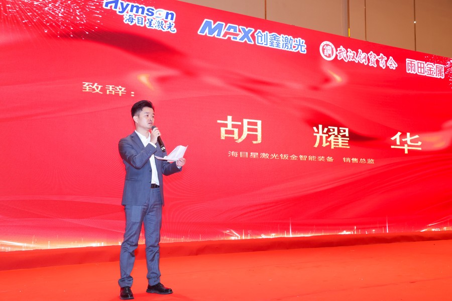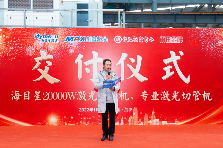 最后,武汉钢贸商会会长程天森代表商会上台,对海目星激光&雨田金属的交付表示祝贺和发表致辞。在一片热闹的掌声中,海目星激光、雨田金属、创鑫激光、武汉钢贸商会代表上台进行了剪彩、揭布和手持遥控器交付庆典,标志着海目星激光20000W高功率激光切割机和专业切管机在雨田金属正式投产使用。