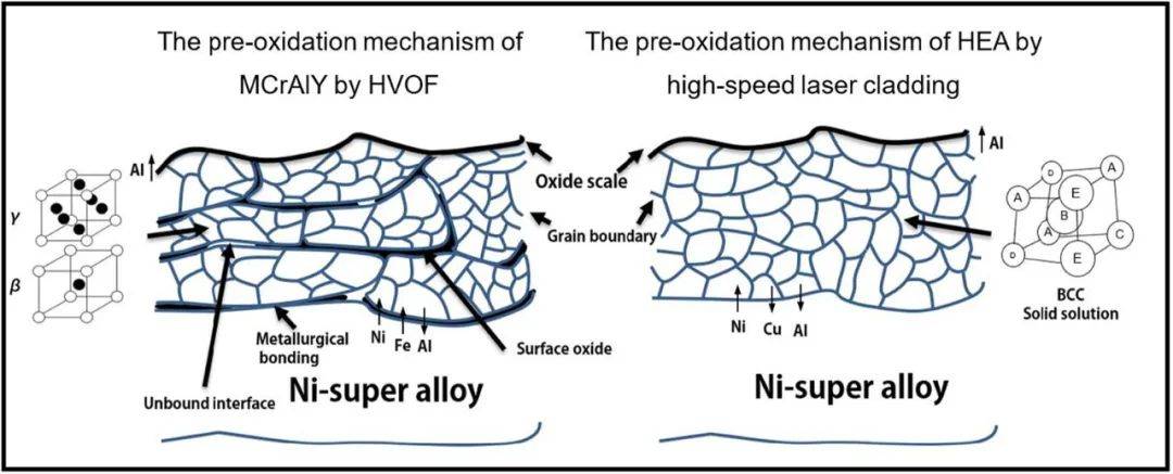 图40 HVOF与LC-HEAC制备的传统MAlCrY涂层预氧化机理差异示意图晶格结构给出了材料不同的扩散系数。由于Al的持续渗透,较好的非粘结界面、表面的氧化膜以及具有较好的层状结构的部分界面结合提供了一种阻塞效应。