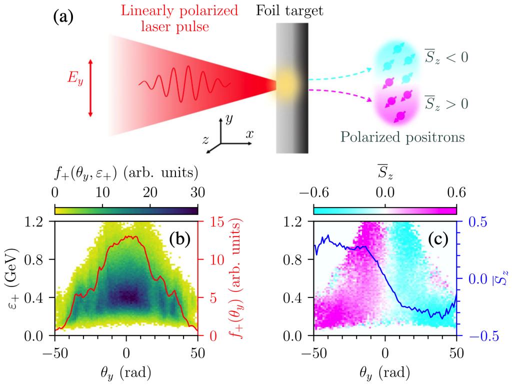 近日,中国人民大学物理系王伟民教授和中科院物理所李玉同教授研究团队,利用自主开发的极化QED-PIC程序(PIC:particle-in-cell,粒子模拟)对未来的百拍瓦激光与固体相互作用中产生的大电量、高密度正负电子束的自旋极化进行了探索研究。发现采用激光固体靶实验上常用构型(即线偏振激光与具有预等离子体的固体靶相互作用)就可在百拍瓦激光装置上产生极化率30%、电量30纳库的正电子束,其角通量可达到1012sr-1,在特定能量段上收集的正电子极化率可达到60%。