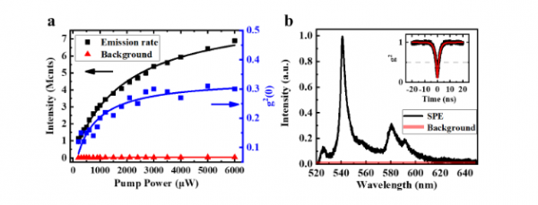 图2. (a)制作出最高亮度单光子源的光子发射速率跟泵浦功率关系。(b)一个典型单光子源的发光峰及其二阶关联函数(插图)
