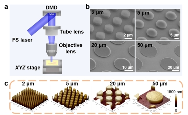 图1.飞秒激光无掩膜投影光刻示意图及制备的微盘阵列拓扑结构