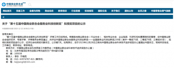 2023年12月22日,中国商业联合会发布了关于“第十五届中国商业联合会服务业科技创新奖”拟授奖项目的公示。根据各地商业联合会(行业协会)、相关专业协会、企业集团、科研机构和高等院校的推荐,经中国商业联合会组织初评、专家评审、评审委员会审定通过,共评出中国商业联合会服务业科技创新奖——全国服务业科技创新奖239项(其中一等奖75项、二等奖79项、三等奖85项)。