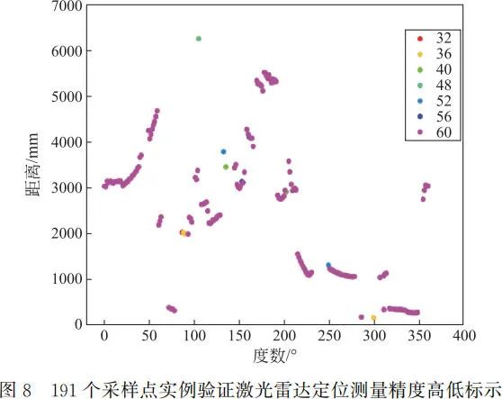 对该定位系统实例验证,将定位测量系统置于北林某教室的一个桌面上,对其周围物体——高于桌面的椅背 191 个样点进行定位(测量数据较为庞大,略去)。MATLAB 绘制测量样点(距离-角度-精度高低)分布图,如图 8 所示。图中数字表示测量精度高低,数字由小到大表示测量精度由低到高。例如角度(Angle)为 104.4°时,样点距离为 6258.5mm,精度数字标识 48。精度数字也就是激光雷达的强度,对于每个采样点,就是激光雷达回波的强度,一定程度上反映被扫描点的反射率,这个值越大,测量定位越好,精度越高。
