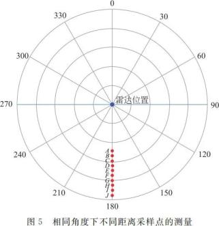 取一张绘图纸,在绘制好的极坐标平面上选取标号为 A,B,C,D,E,F,G,H,I,G,K,L,I,J 共 10 个点,它们的方位角均为 180.0°,如图 5 所示。测量上述 10 个点与坐标原点即激光雷达的距离,对照为平面极坐标中以毫米尺所测距离为实际距离,计算测量值相对实际值的误差,测量结果如表 1 所示。