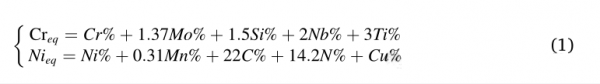 焊接是一个高温过程,包括熔化材料,然后冷却和凝固。焊接接头的最终微观结构是凝固相变的结果。在不锈钢的情况下,预测微观结构特征通常涉及确定凝固性,使用Creq/Nieq比率的离子模式。对于奥氏体不锈钢,计算Creq/Nieq比率的常用公式如下: