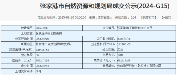 作为激光行业龙头企业,大族激光的每一步布局都牵动行业神经。2025年8月,大族激光科技(张家港)有限公司以6522.7195万元竞得张家港市保税区141490.66平方米工业用地,为其华东区域产能扩充落下关键一子。该地块采用江苏首创的“标准地+双信地+定制地”出让模式,政府提供“三净地”保障,实现“成交即发证、交地即开工”,企业则承诺固定资产投资强度不低于802万元/亩,彰显政企协同发展的高效性。