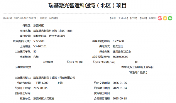 武汉作为“中国光谷”所在地,始终是激光产业的战略高地。2025年9月,瑞基激光智造(武汉)科创有限公司以8620万元拿下东西湖区5.2256公顷土地,启动总投资17亿元的科创湾(北区)项目,计划2027年开工、2029年竣工,打造激光产业创新生态综合体。