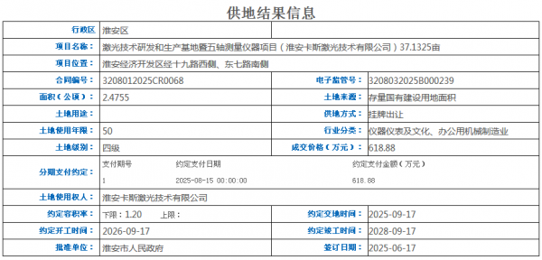 在激光产业高端化进程中,核心部件与精密测量技术的突破成为关键。2025年6月,淮安卡斯激光技术有限公司以618.88万元竞得淮安经济开发区37.13亩土地,启动激光技术研发和生产基地暨五轴测量仪器项目,将于2026年开工、2028年竣工,专注激光核心技术攻坚。
