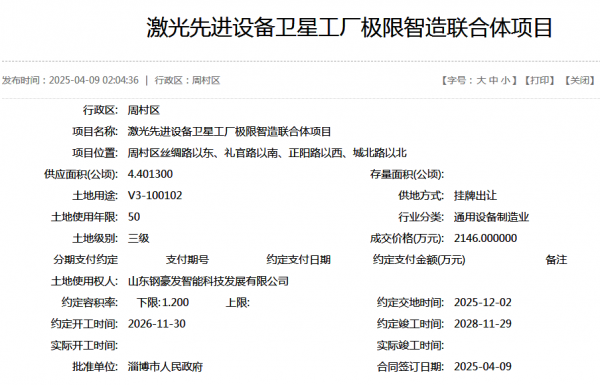 2025年4月,山东钢豪发智能科技发展有限公司以2146万元拿下淄博周村区4.4013公顷土地,投资2.8亿元建设激光先进设备卫星厂极限智造联合体项目,计划2026年开工、2028年竣工,聚焦光纤激光切割机量产。