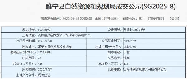 在激光产业向区域纵深渗透的过程中,县域经济成为重要承接载体。2025年7月17日,江苏博朗智能激光科技有限公司以415万元底价竞得睢宁县高作镇SG2025-8号工业用地,地块面积1.649465公顷。该地块约定2025年12月1日开工、一年竣工,从拿地到投产周期仅18个月,凸显中小企业“快布局、快落地”的发展特点。