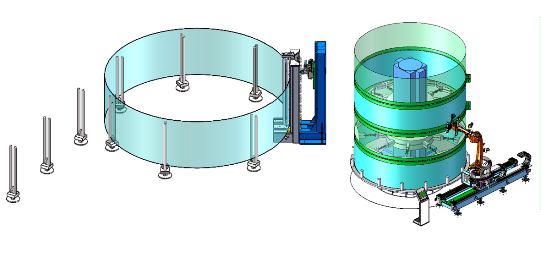 火箭筒段采用蒙皮桁条结构,即由不锈钢薄板卷焊形成的短环与均布于筒段内壁的加强桁条,通过激光断续叠焊连接而成。大族激光桁条激光焊接设备采用立式生产模式,集成短筒竖直支撑与定位装置、桁条装配焊接工装、激光焊接系统等核心单元,并配备升降操作平台,便于装夹、检验及设备调试与维护。