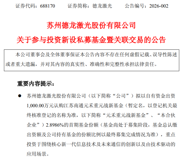 1月28日,德龙激光发布关于参与投资新设私募基金暨关联交易的公告。