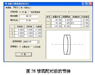 玻璃配对完成后,就可根据系统对透镜的要求自动计算出透镜的PW值以及透镜结构参数,并列于表中,同时还显示出透镜的结构示意图,如图28。