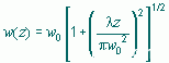 这里的z是当波阵面平坦时从平面上的传播路径,l是光的波长,w是当波阵面平坦时,在平面上1/e2发光轮廓的半径,w(z)是在波传播了距离z以后,1/e2轮廓的半径,R(z)是在波传播了距离z以后,波阵面的曲率半径。在z=0的条件下,R(z)是无穷大的,在某种有限的z的最小值内传播,并且当z进一步增大的时候,趋近于无穷大。Z=0平面标记了高斯腰的位置,或者表示波阵面是平坦的地方,这里w0叫做光束腰半径。