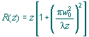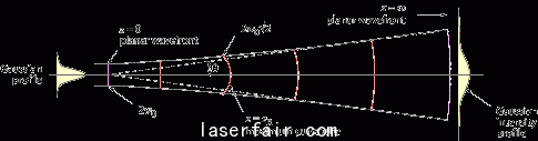 即使一个高斯TEM(横模和纵模为0)激光光束波阵面在某个平面可以保持非常的平坦,它也需要弯曲并且通过如下的公式传播