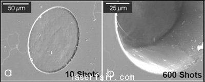 图2. 钻石经193nm准分子激光烧蚀形成的凹坑:左图为10个激光脉冲情况,右图为600个激光脉冲情况。凹坑的平整度表明了准分子激光光束在整个照明区域具有极高的均匀性。