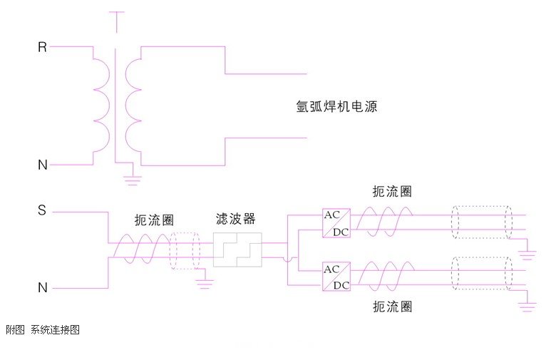 在本案例中,氩弧焊机电源与伺服驱动器供电电源分别供给。氩弧焊机电源用隔离变压器隔离,伺服电源线外套一个扼流圈后送入有源功率滤波器,经过滤波后,再送至开关电源。伺服驱动器的动力电源和控制电源用2个开关电源分别供电,且在接入驱动器前分别套一个扼流圈。驱动器电源与控制(编码器)电源均连接了屏蔽线,并确保单端可靠接地。如附图为系统接线图。