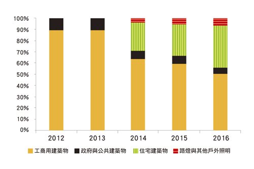 与LED照明发展初期相同,智能照明系统因为初期建置成本较昂贵,因此建置所能带来成本下滑幅度多寡,变成消费者是否采纳的关键。由于办公大楼、百货公司、复合式商场以及量贩店等,照明设备占耗电比重均达25~30%,因此工商用市场成为智能照明系统主要需求者。就2012年来看,工商用市场占比即接近90%,其次则是政策导向的政府与公共建筑,占比约在10%左右,预计住宅部分要等到2014年,相关产品价格大幅滑落后,占比才会有显著增长(图3)。